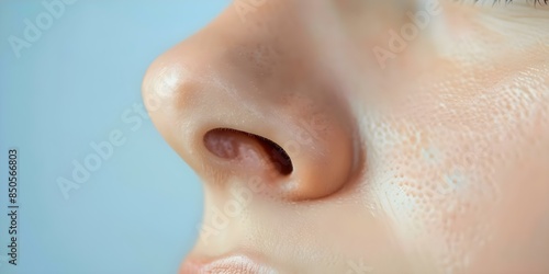 Closeup photo of a human nose showing nostrils bridge and nasal hairs. Concept Close-up photography, Human anatomy, Facial features, Nasal details, Macro photography