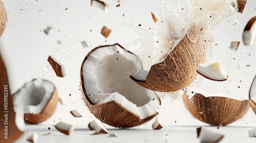 A stack of cracked coconuts being thrown up in the air with palm fronds