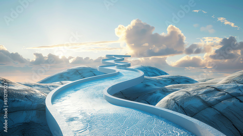 Surreal water pathway in a fantasy landscape with mountains and clouds on a sunny day. Dreamlike and serene scenery.