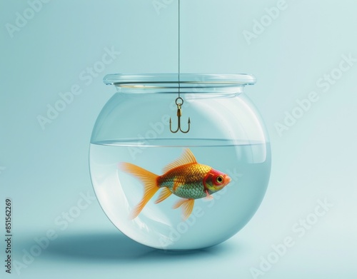 Goldfish in fish bowl with hook captivity and freedom in a tiny world of contrast and irony