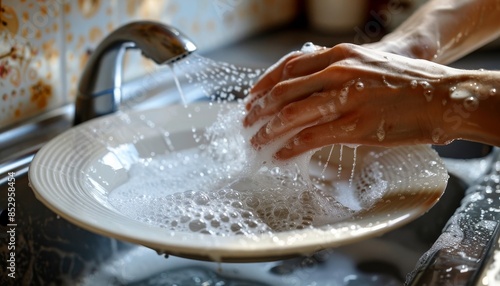 Hands cleaning white ceramic dish with soapy water in kitchen sink for effective dishwashing
