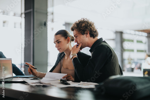 Young professionals working together in the office, discussing project details using a laptop and documents. Focused and collaborative work environment.