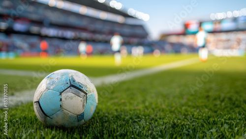 vue au ras de la pelouse d'un stade de football avec ligne de touche et ballon