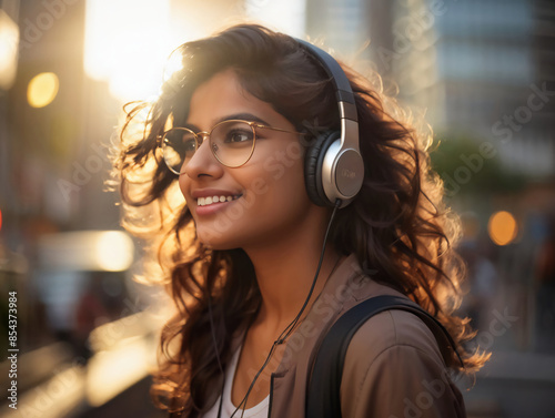 Close-up photo of a young smiling female student wearing headphones and glasses standing outside in the city and looking away