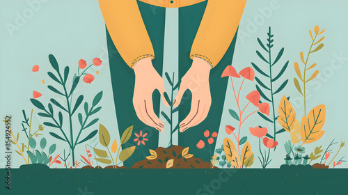 A person planting seeds in a garden, symbolizing growth and healing in mental health, illustration.