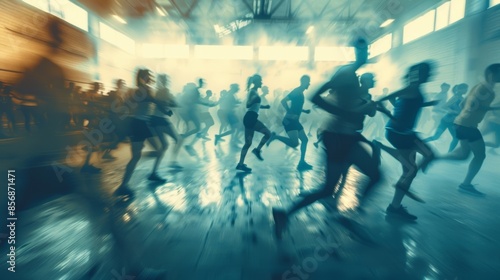 Blurry outlines of participants engage in an indoor bootcamp challenge.