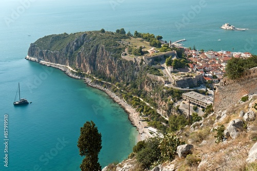 View of Nafplio town, Acronauplia and Bourtzi island from Palamidi fortress. Nafplio is situated on the Argolic Gulf in the northeastern Peloponnese. Greece. Europe.