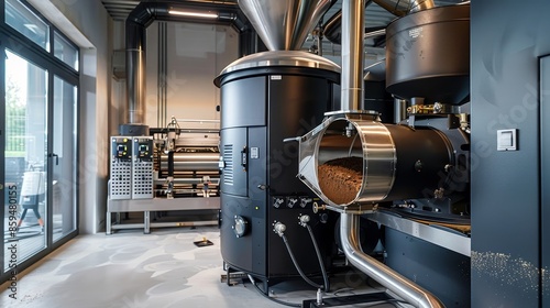 Close-up of coffee beans being roasted and sorted in a modern factory with advanced machinery, showcasing the precision of the coffee production process.