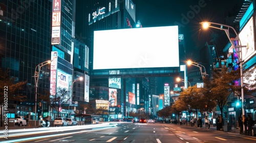 Create an image of a brightly lit, empty billboard with lights, situated in the bustling city center of Gangnam District, Seoul.