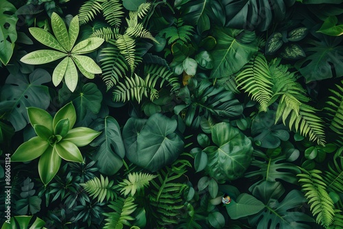 Dense tropical foliage, showcasing a vibrant and lush forest ecosystem, perfect for eco-tourism and nature reserves. Generative AI