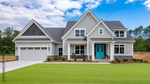 Gray new construction modern cottage home with hardy board siding and teal door, featuring excellent curb appeal.