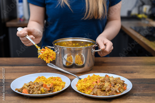Danie jednogarnkowe, kobieta nakładać obiad ze stalowego garnka na talerze
