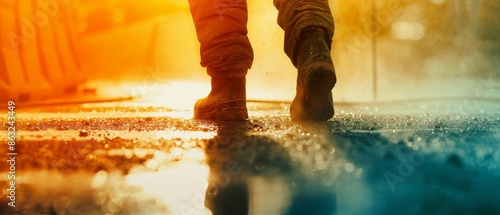A pair of feet walking on a wet, reflective surface. The sun is shining, creating a warm glow.
