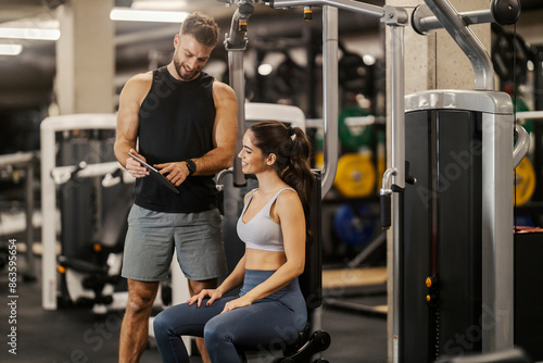 Fit sportswoman sitting at machine in a gym and having consultations with her fitness trainer.