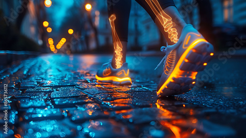 Runner performing calf stretches with a glowing xray effect on the foot to prevent plantar fasciitis