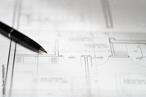 Długopis leży na rozmytym projekcie domu, biuro architektoniczne