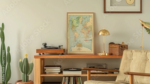 Retro composition of living room interior with mock up poster map, wooden shelf, book, armchair, plant, cacti, vinyl recorder, decoration and personal accessories in stylish home decor.