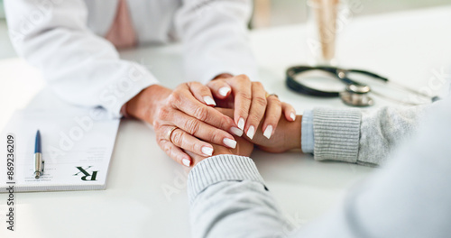 Doctor, patient and holding hands on desk in consultation room with support, empathy and announcement. Medic, person and care with comfort, diagnosis and helping with healthcare service at hospital