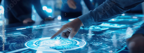 A close-up shot of the hands touching on an interactive touch screen table displaying data