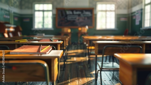 A close-up view of an empty classroom with wooden desks lined up, and a blackboard in the background. Ai generated image
