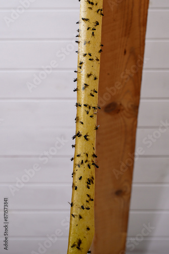 Plaga much w domu, na suficie wisi pułapka, lep na muchy wypełniona owadami