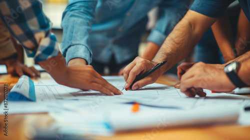 Close-up of a team collaborating over blueprints or plans on a table