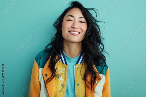 Portrait of a happy asian woman in her 40s sporting a stylish varsity jacket isolated on soft teal background