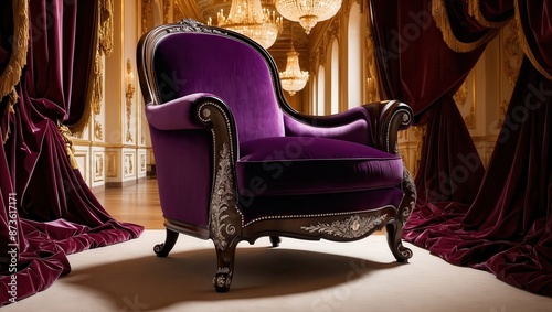 A majestic 4K resolution regal purple luxury chair, situated in a grand opulent palace ballroom