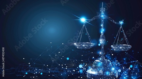 Scales of justice with holographic law symbols, blending traditional and modern jurisprudence