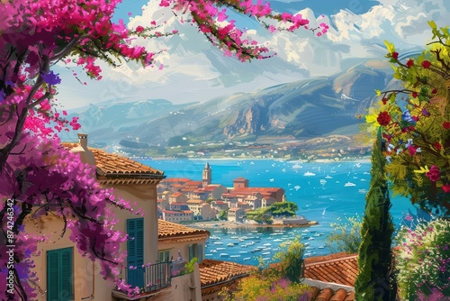 picturesque coastal town landscape with colorful azalea flowers in full bloom french riviera scenery digital painting