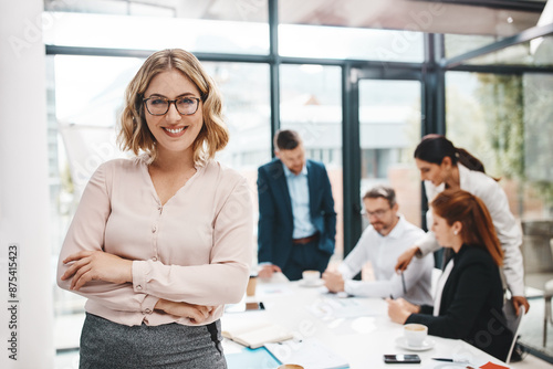 Crossed arms, manager and portrait of business woman in office with confidence for career growth. Smile, pride and female finance banker with team for company investment with meeting in boardroom.