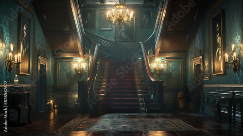 Grand, dark staircase in a stately home, shrouded in shadows and antique elegance.