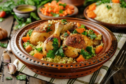 Moroccan Food. Traditional Chicken Tagine with Couscous and Salad in Ceramic Dish