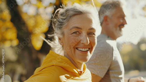 A photo of an elderly couple jogging in the park, smiling and wearing sportswear