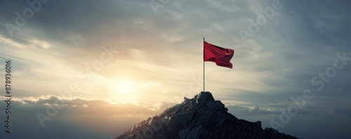 Red flag on a mountain peak during sunrise, symbolizing victory, achievement, and exploration against a picturesque sky backdrop.