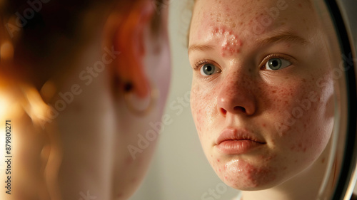 ashamed and worried teenage girl with severe acne looking in mirror, puberty hits