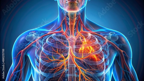 A futuristic 3D animation conceptualizing human respiratory system's intricate lung anatomy with pulmonary veins, arteries, and bronchi in vibrant colors.