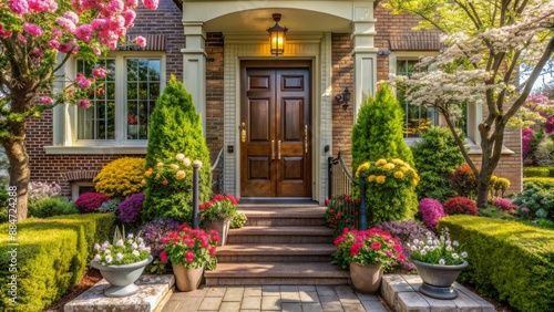 Beautiful elegant entrance to luxury house with modern door, vibrant spring decorations, and lush greenery, showcasing opulent exterior design.