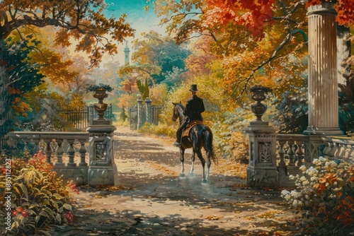 Man riding a horse in a beautiful garden art painting autumn.