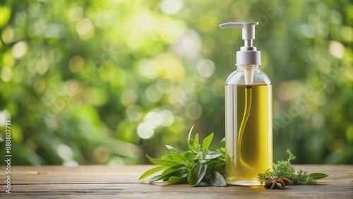 Elegant, label-free kitchen cooking oil bottle with white pump dispenser situated among blurred lush greenery, showcasing sleek product design.