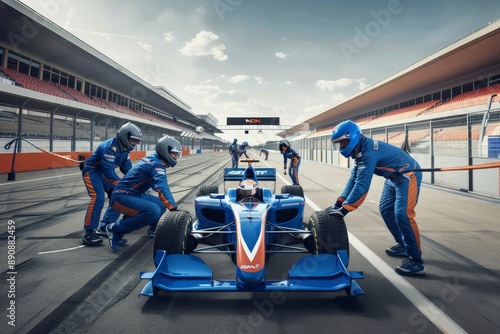 Ultimate teamwork professional pit crew prepared for action as race car enters pit lane for pitstop