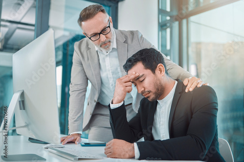 Business men, colleagues and console in office with support for grief, depression and mental health. People, boss and attorney with care, connection and empathy for mistake in workplace at law firm