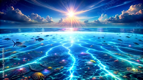 A vast, artificial ocean, shimmering with holographic projections of marine life, stretches towards the horizon, a testament to human ingenuity. Generative AI Computer-generated