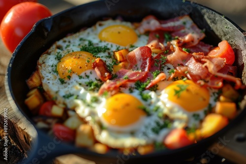 Close-up of a delicious skillet breakfast with crispy bacon, fried eggs, and diced potatoes