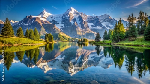 Serene mirrored reflection of majestic Eiger M?nch and Jungfrau mountains in a calm alpine lake surrounded by lush greenery.