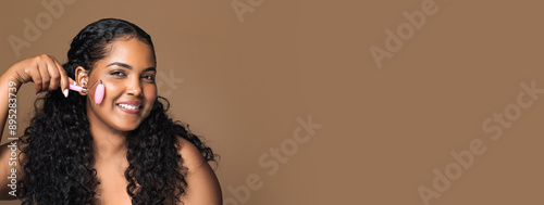 Happy brazilian oversize lady doing jade massage to face with quartz roller, smiling at camera, posing isolated on brown background, copy space. Beauty care, anti-wrinkle procedure