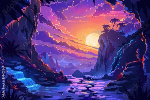 Mystical moonlit jungle landscape with waterfalls and ruins