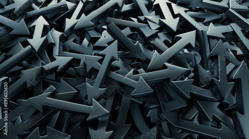 A chaotic pile of black arrows pointing in various directions, symbolizing confusion or diverse choices in a complex scenario.