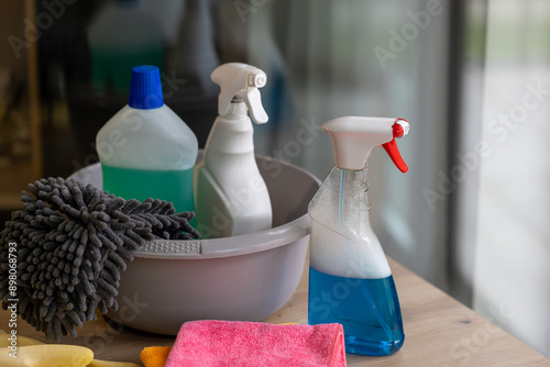 a bucket of cleaning supplies on a table