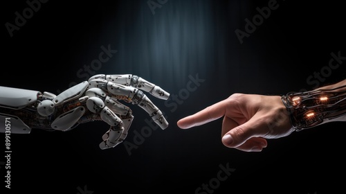 A robot hand and a human hand touching fingertips, creating a sense of connection and innovation with a modern, clean background